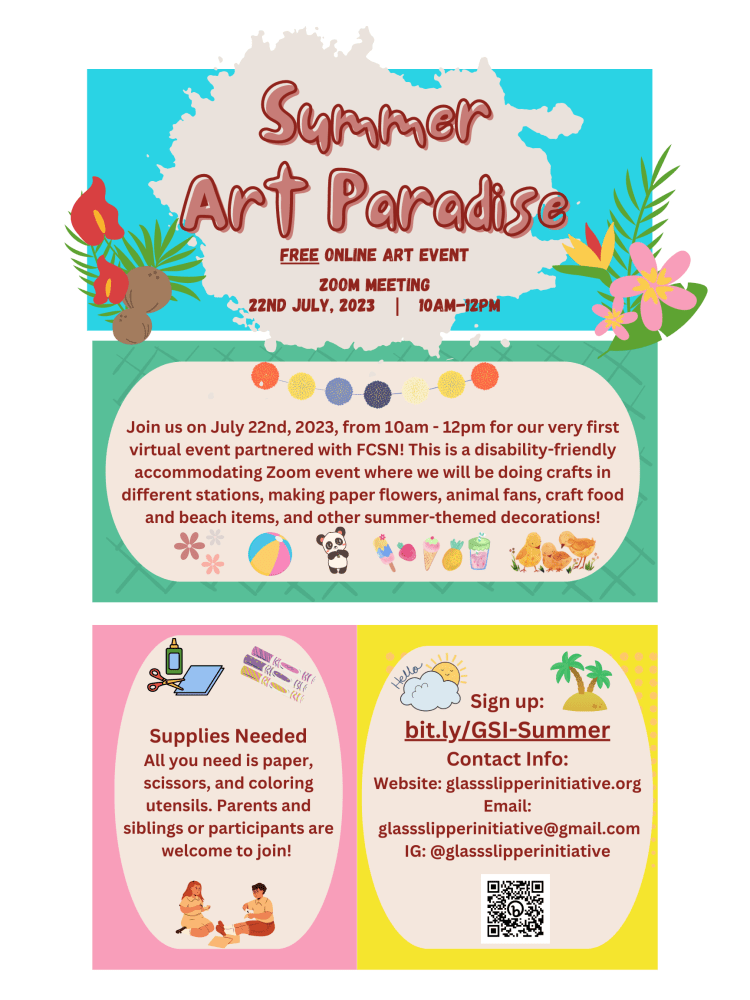 Join Glass Slipper Initiative and Friends of Children with Special Needs for a free online art event for children with disabilities and their families! It will be on July 22nd from 10 AM to 12 PM, where we’ll have multiple stations for different crafts ranging from paper flowers to fun summer decorations for any skill level. All you’ll need is paper, scissors, and some coloring supplies! Sign up at bit.ly/GSI-Summer and email us at glassslipperinitiative@gmail.com if you have any questions!